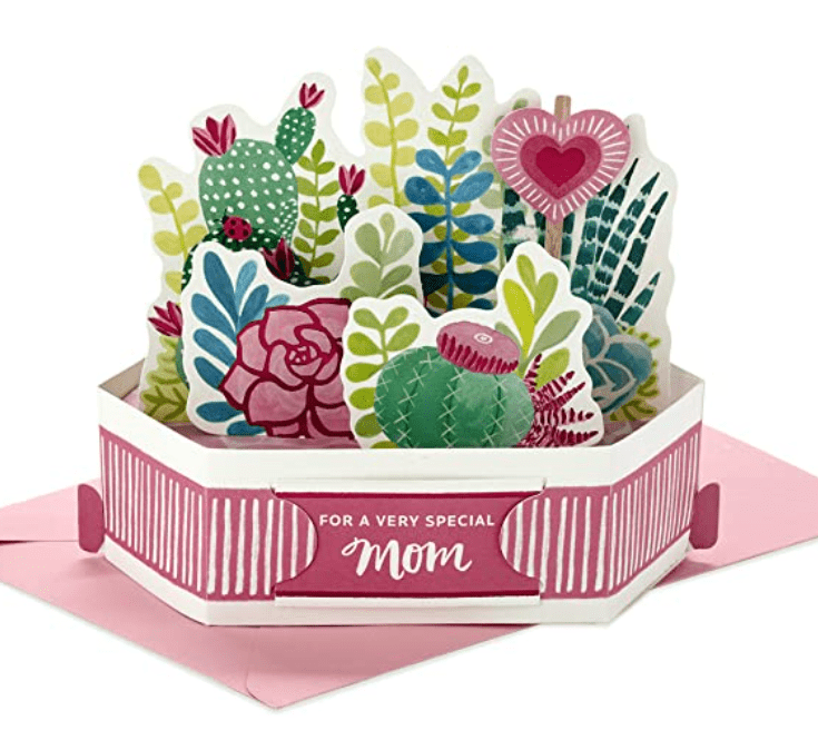 For those that have a smaller budget, this adorable pop-up card is perfect! The card folds flat for mailing and then when your mom opens the card it will pop into a 3-D pot of succulents!