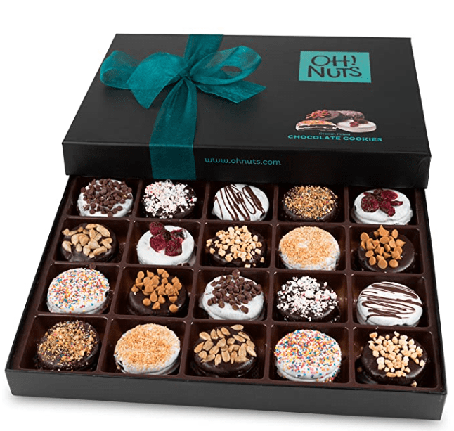 These are SO good! Does your mom have a sweet tooth? She will LOVE these chocolate-covered cookies! They are Oreo cookies, dipped in chocolate that have little topping over them. Their reviews are glowing and they come in a beautiful box.